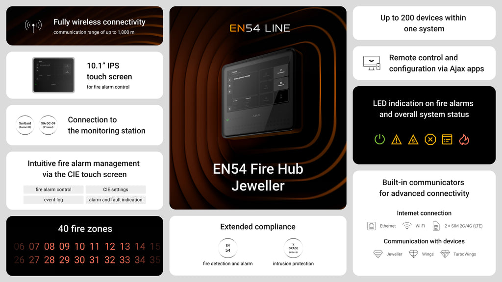 The AJAX EN54 Fire Hub Jeweller is your no-nonsense fire safety command centre. This wireless system gives you instant status updates and alarm notifications on a large touchscreen, so your team knows what's happening straight away. It installs quickly, needs minimal fussing about, and connects to monitoring stations without delay. Beyond fire protection, it handles intrusion detection, video surveillance, and automation all in one unit—making it the smart choice for commercial and municipal operations. Built-in communicators keep you connected, while visual verification support helps your staff respond with confidence. Straightforward compliance, proper protection, job done